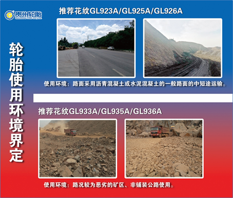 GL923A/GL925A/GL926A係列(liè)輪胎推薦用於渣土、沙(shā)石等工地上,並(bìng)伴有混合路麵行(háng)駛的中短途載重自卸車。該係列(liè)輪胎采用低生熱配方,車速(sù)(重載)控製在60km/h以內的中短途(tú)運輸,輪胎的散熱(rè)性能會更優(yōu)越;加厚的胎側設計,胎側的剛性更強,有效防止雙胎並裝(zhuāng)時胎側夾石,為(wéi)輪胎提供更好(hǎo)的安(ān)全保護;具有核心專利的(de)輪胎子口設(shè)計,為輪胎提供更好的承載性能。